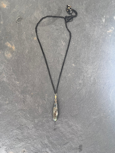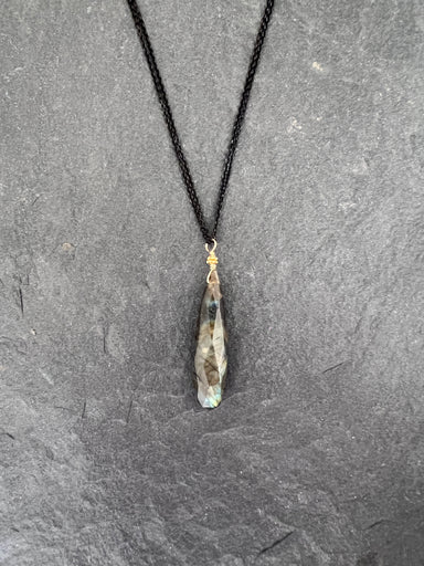 Beautiful, flashy labradorite gemstone has been cut into a slim, teardrop shape to capture all of the light. Hung on a 24" double chain in black-pl...
